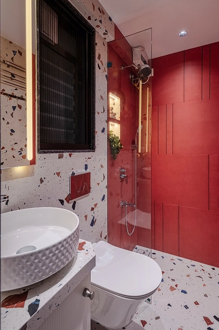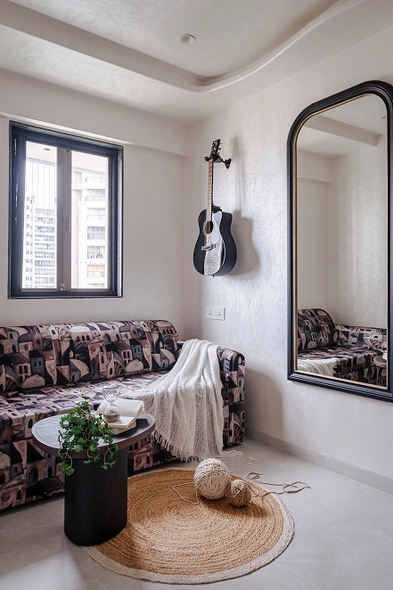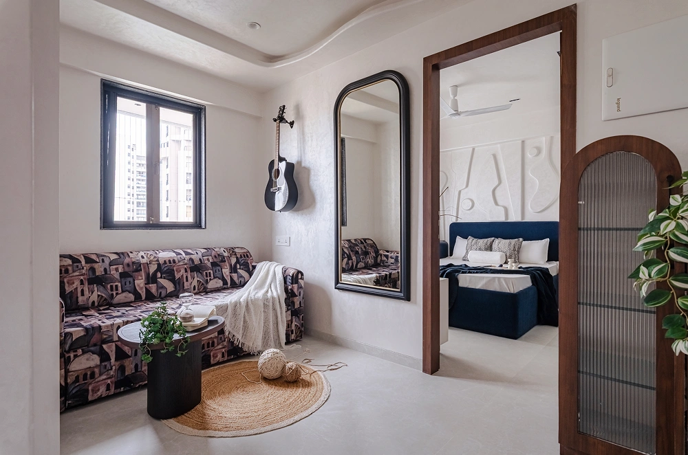 A cozy corner that connects living room’s curve ceiling together here— featuring an arched L-shaped tall short unit along with a seating and a statement sofa-cum-bed upholstered in a unique fabric printed with huts and houses, inspired by the Japanese mountain villages. This space brings an earthy charm and storytelling element which is shown by the wooden texture in unit and printed fabric. Overall keeping functionality of the space in mind and to put the look together we have added a long mirror.