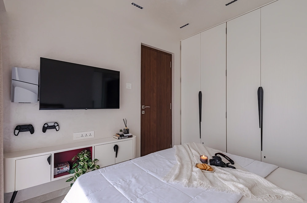 The rest of the room follows a muted and balanced palette — walls and ceiling finished in soft texture paint and clean white tones, creating a serene backdrop for daily life. The space feels light yet grounded, echoing the philosophy of simplicity through thoughtful detailing.