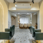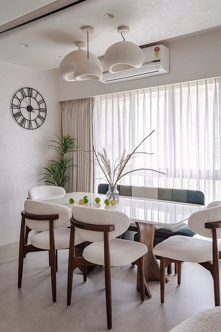 The heart of The Kanso House reflects warmth, balance, and calm minimalism. The living area opens into a 6-seater dining space, designed for togetherness. Custom-made wooden white dining chairs beautifully paired with a green ombré tones bench with green ottoman below, creating a blend of elegance and comfort with onyx dining top.