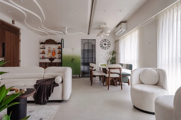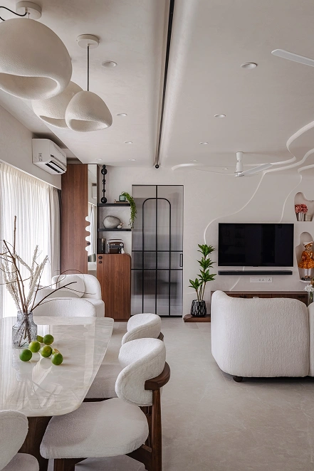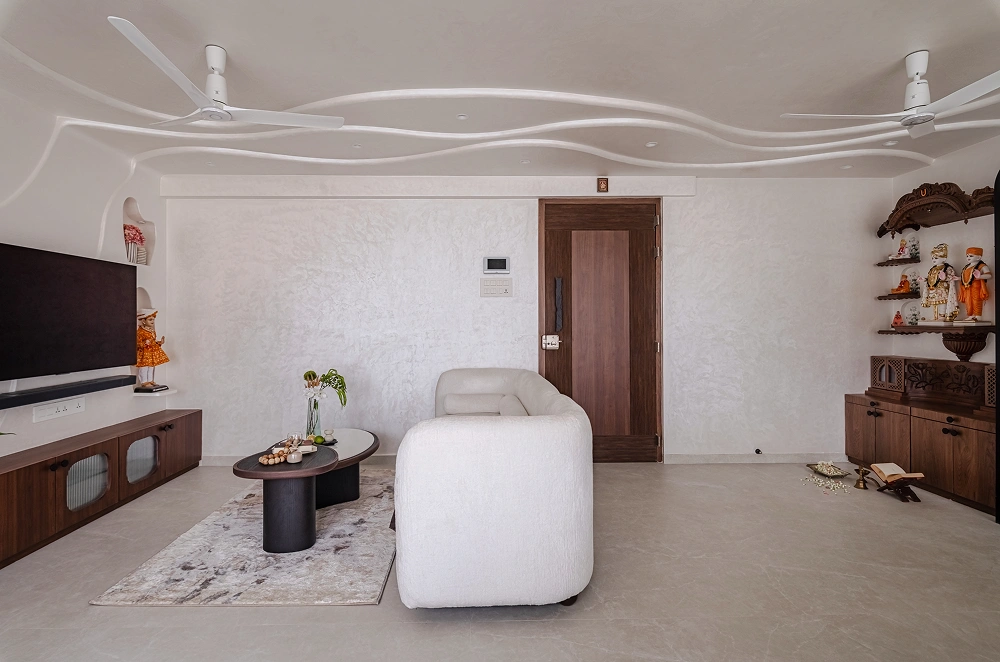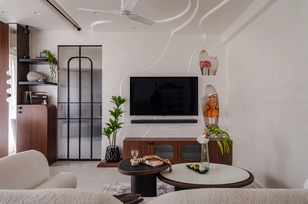 The ceiling in living room is a true highlight — a continuous hand-drawn curved design that flows seamlessly across the living area and gracefully dips down onto the TV unit, acting as the visual centrepiece of the home.