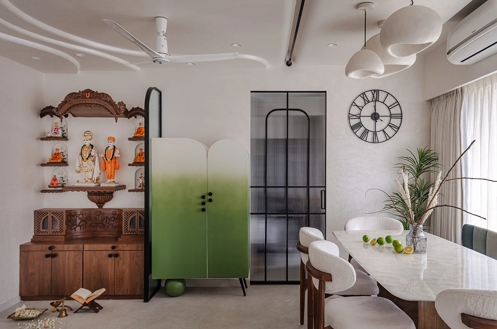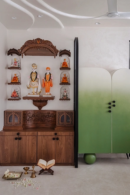 Adjacent to the dining, the temple stands out as a pure SAAG wood creation, — thoughtfully customized where every block of the wood was planned by keeping curvilinear and spherical design of the house in mind. Where every piece of wood block is hand crafted and meet the client’s vision perfectly. Beside it, the green ombré PU-painted crockery unit adds a fresh play of color and ties the area together.