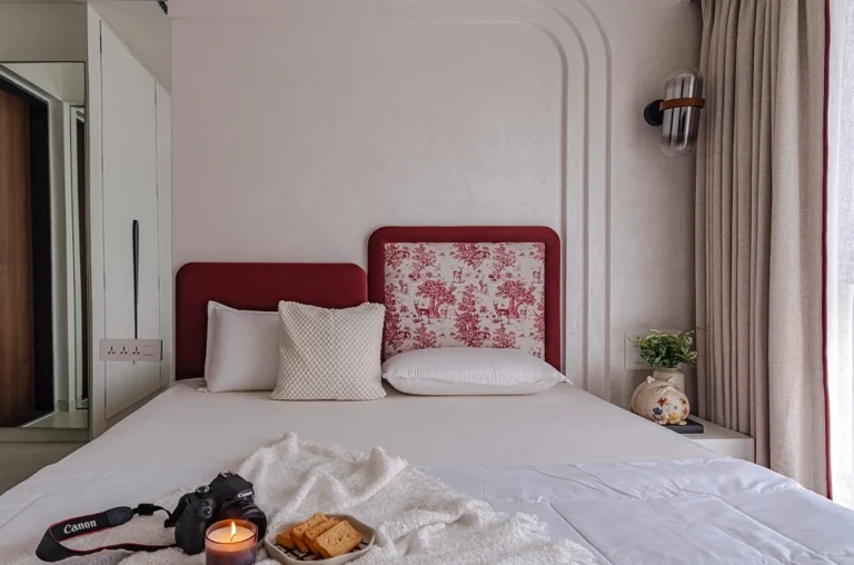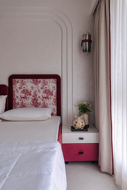 The son’s bedroom captures the youthful calmness of Japandi design while reflecting a deeper story rooted in Japanese culture. The focal point of the room is the maroon and white printed headboard — inspired by the Sika deer (Cervus nippon), known as the sacred messenger of the gods in Nara, Japan. This symbolic element adds meaning and personality, connecting nature and spirituality within the home’s design language.