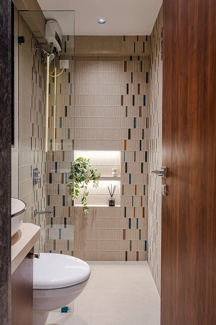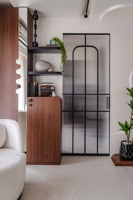 Right besides entrance door, a shoe rack with seating has been thoughtfully designed for comfort and convenience, topped with a soft cushioned seat that invites pause. To complete the setting, a lotus stem planter adds a natural green accent, infusing freshness and elegance into the entryway — a quiet yet striking design statement that perfectly echoes the Japandi philosophy of simplicity meeting nature.