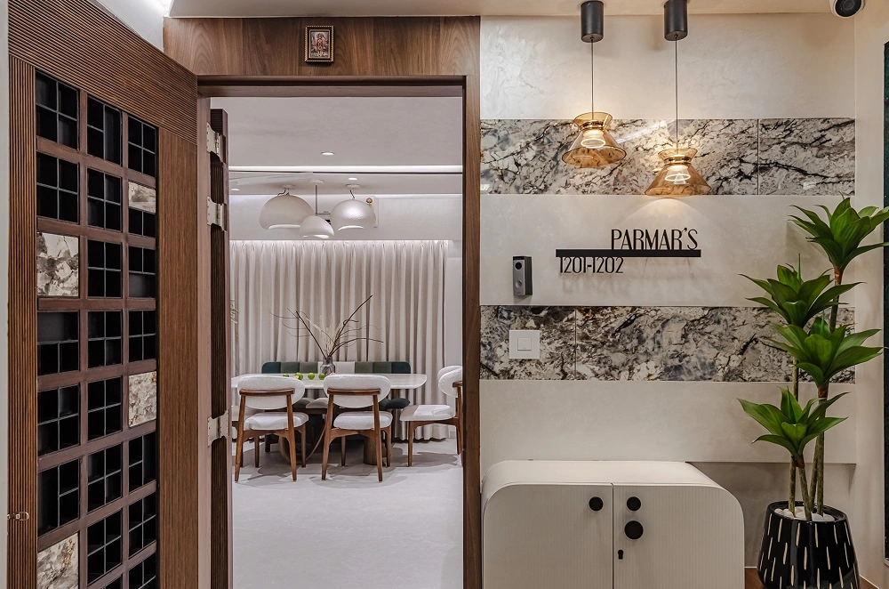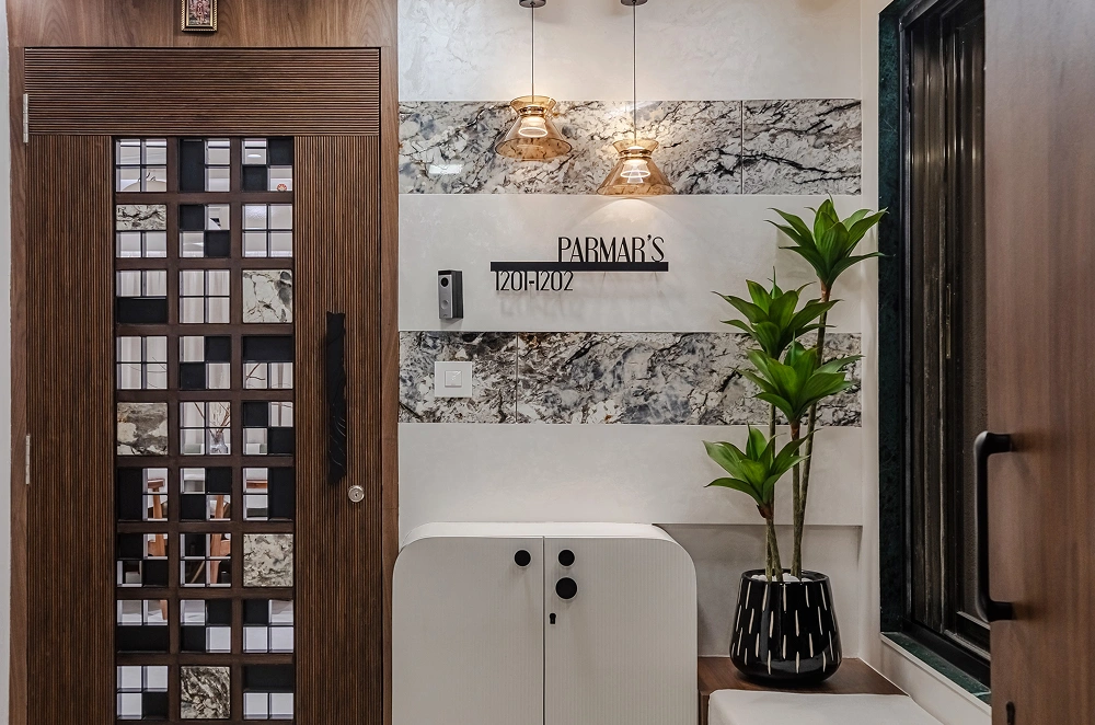 The entrance of The Kanso House sets the tone for the calm interiors within. The safety door, designed in a wooden texture rafter with custom metal jali finish in black powder coating with subtle stone inlay detail enhances its tactile richness — a refined nod to handcrafted artistry.