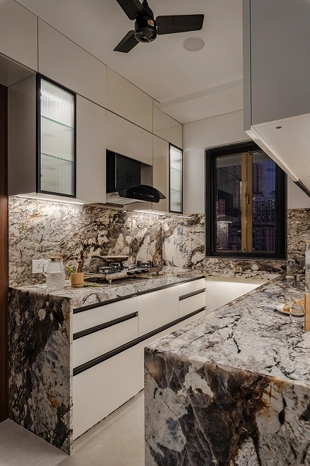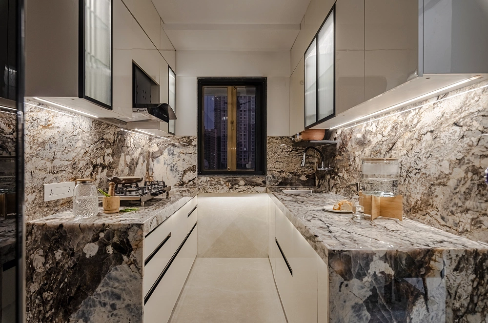 The kitchen carries forward the theme of simplicity and strength. With a heavy granite countertop and matching dado, the space feels grounded and timeless. Cabinets are kept minimal in clean white tones, giving a spacious and bright appeal. Subtle sleek black fittings balance the warmth and contrast — a perfect reflection of Japandi harmony between form and function.