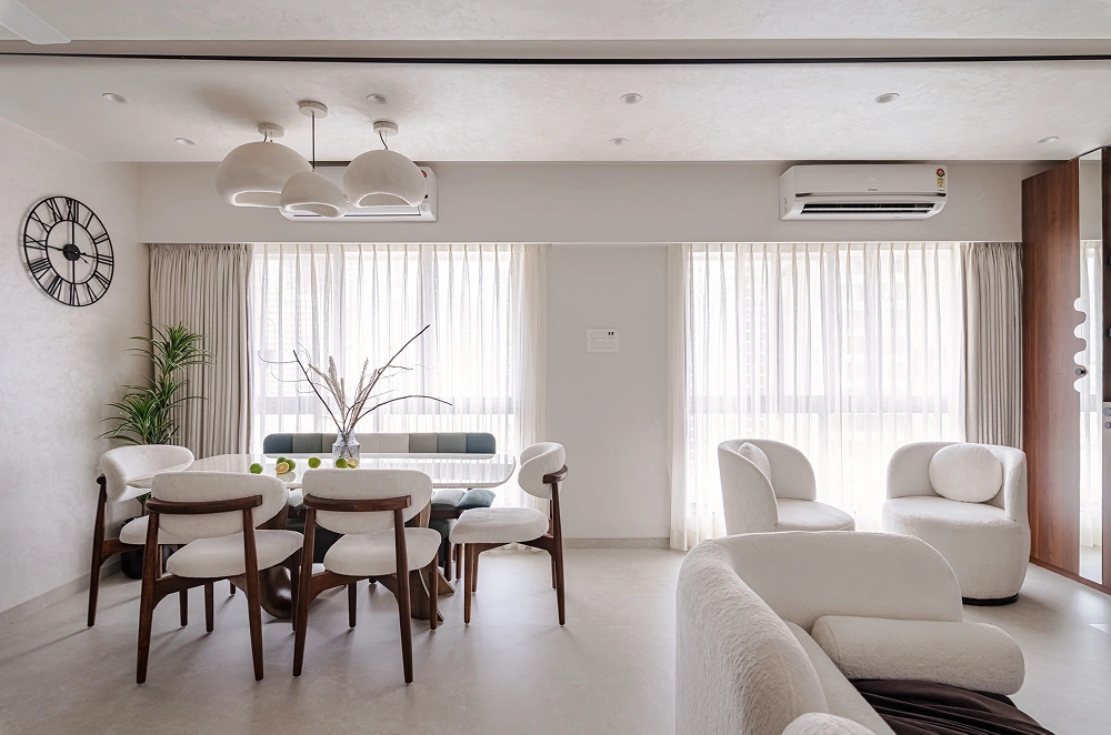 Soft sheers and main curtains frame the room gracefully, while a planter by the dining corner adds a fresh, organic touch.