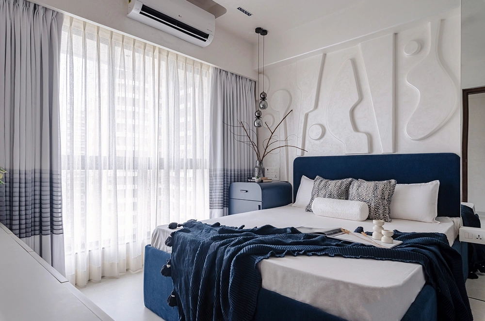 The master bedroom exudes serenity with its hand-drawn abstract headboard wall crafted in POP and finished with texture paint. This feature wall sets the tone for the entire room — calm, artistic, and deeply personal.