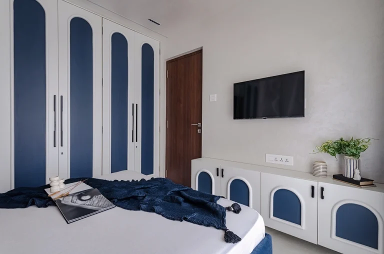 Breaking away from convention, the side table has been designed with taller proportions, adding a touch of modern experimentation. The wardrobe and TV unit continue the theme of gentle arches, detailed in a combination of PU and laminate finishes, adding layers of visual interest and sophistication.