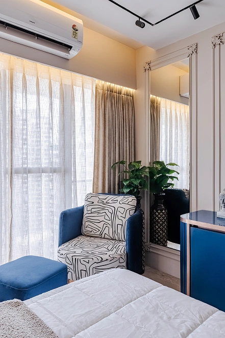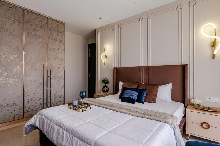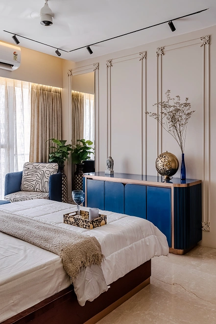 Stepping into the master bedroom is akin to immersing oneself in a symphony of textures. The electric blue PU handle-less console, punctuated by rose gold metal designs, demands attention as it stands in stark contrast to the beige walls adorned with intricate moulding. Wardrobes draped in sumptuous velvet laminate, accentuated by rose-gold corner strips, harmonize effortlessly with the secondary colour palette of the bed – an inviting brown suede fabric upholstery. A masterful blend of opulence and relaxation, making every night a true luxury.