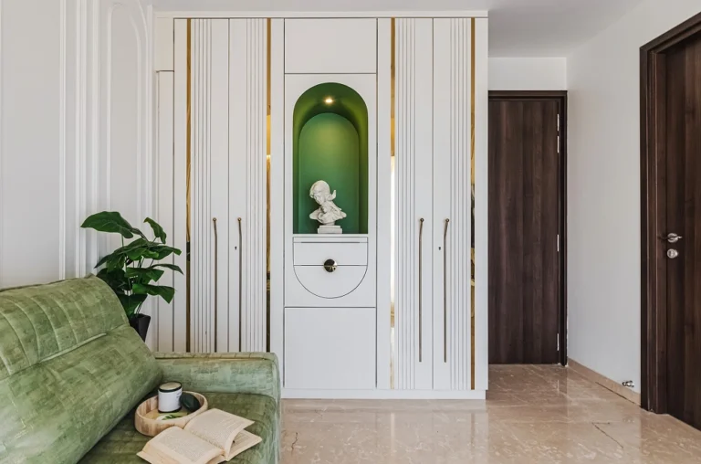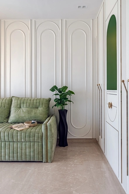 Transforming the Multi-purpose room into a serene sanctuary with a touch of nature. Loving the stunning green sofa paired with elegant white moulding, creating a perfect balance of tranquillity and sophistication. A wardrobe adorned with grooves and a thick gold strip injects an element of exuberance.