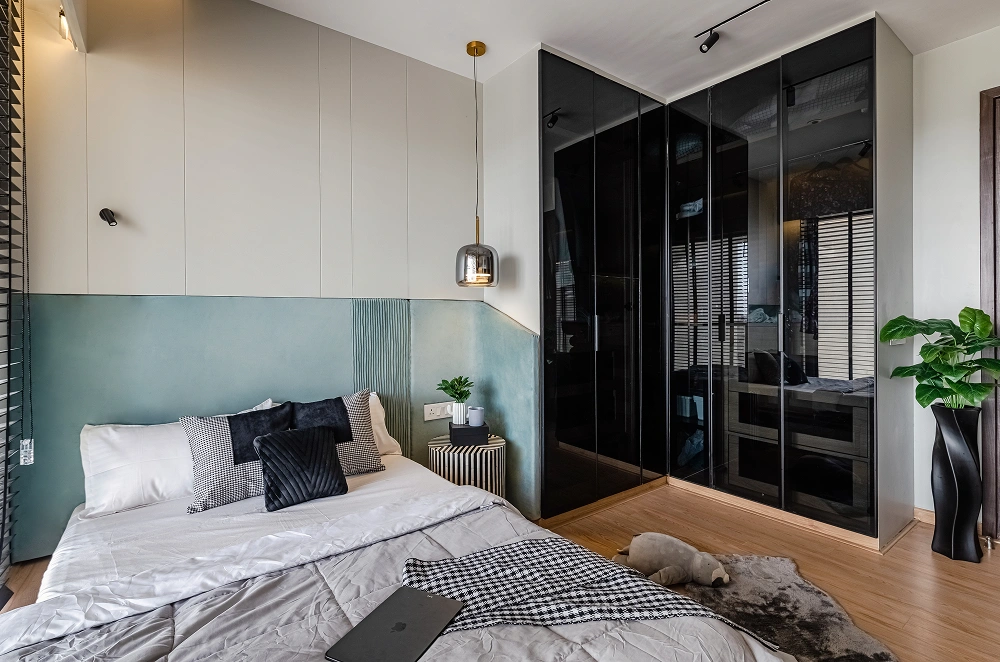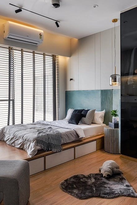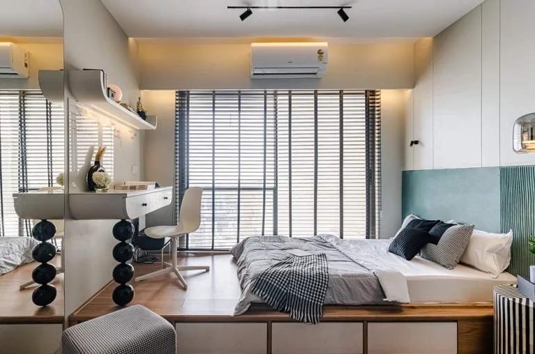 The daughter’s bedroom unfolds with warmth exuding from its wooden flooring, while a low bed, seated atop a raised platform with concealed storage, adds functionality. The daughter’s personal touch can be felt in her unwavering choice of blue velvet upholstery for the headboard, elegantly offset by a sleek black-tinted wardrobe. But wait, there is more! A unique study table awaits, where she will explore new worlds and conquer her goals.