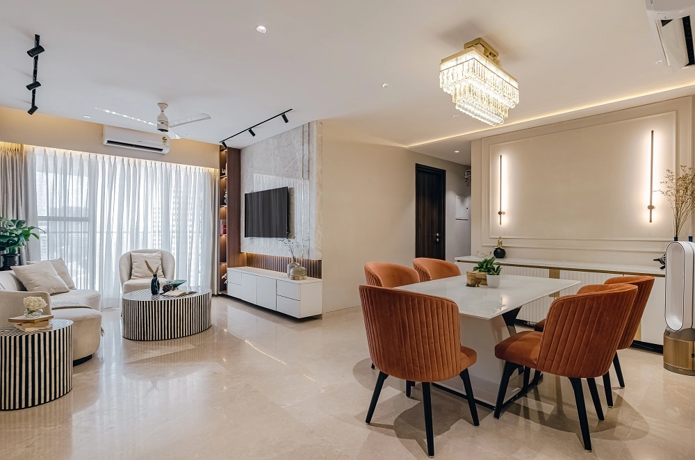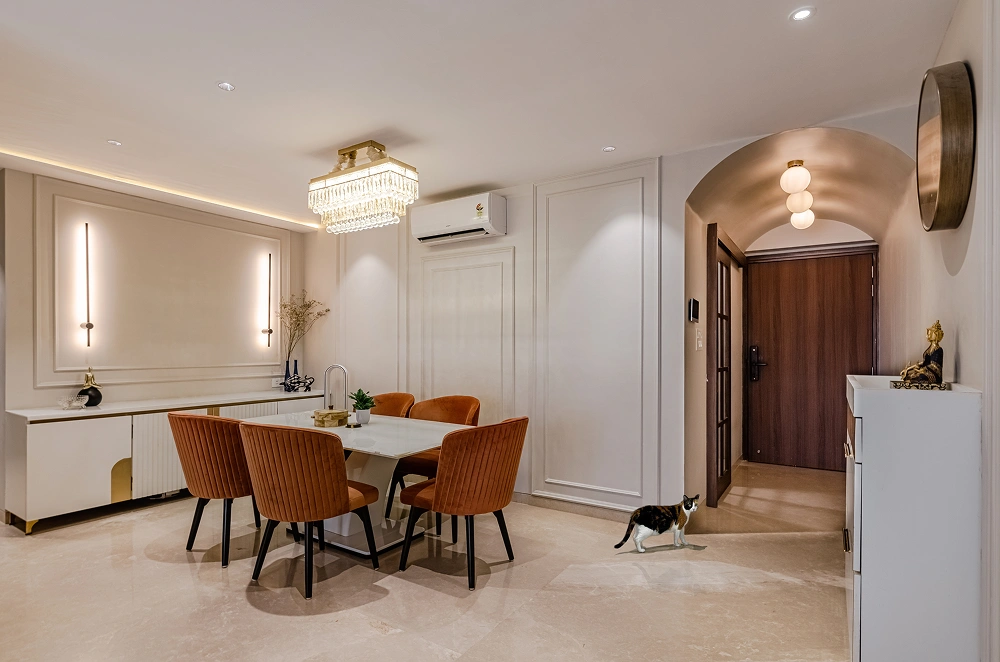 In a mere span of three months, this once conventional flat has been transformed into a breathtaking dwelling that echoes the unique aspirations of its inhabitants. The grandeur of the abode is unveiled as one steps into the expansive living room, its ceiling gracefully curving to greet the eye while pendant globe lights cast a soft and inviting glow. Walls adorned with intricately carved moulding, painted in a calming beige hue, complement mirrors adorned with gold strips, evoking an air of opulence. The TV panel, adorned with a Swarovski crystal onyx, transforms into a luminous spectacle when light dances upon it. The TV unit, crafted from pristine white Corian stone, is flanked by a wooden texture laminate showcase rack, a marriage of modern aesthetics and functional design. The dining area, an epitome of refined taste, showcases a dining table crowned with a crystal onyx top, its natural patterns speaking of elegance. Complementing the table, vibrant orange velvet dining chairs invite conversations that linger long after the meal has concluded.