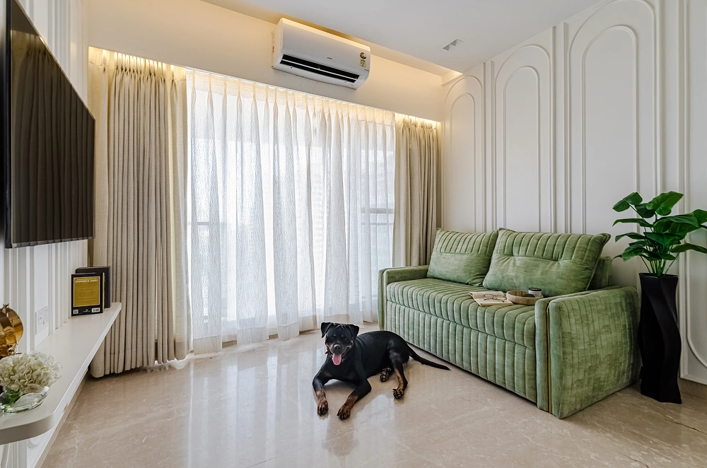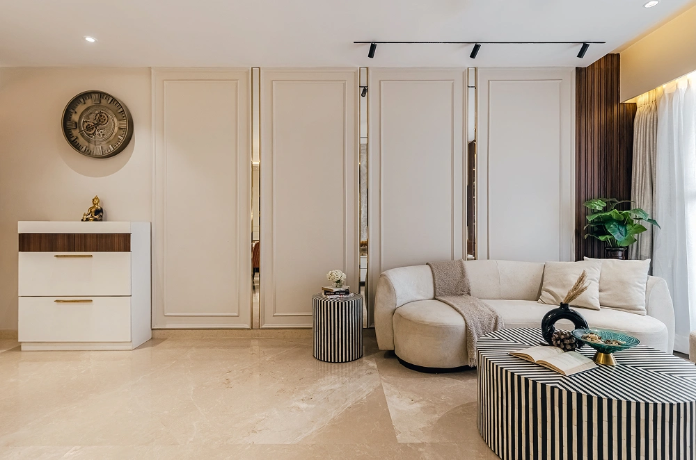 Capturing the essence of a harmonious living space, the lens is turned towards the interior marvel meticulously curated by Lead Designers Dishank Kamdar and Srushti Dhamecha from The Design Ellements . Nestled within the exclusive embrace of The Park Luxury Residencies, Lokhandwala, this 1500 sq.ft. 3-bedroom apartment stands as a testament to their design philosophy. Catering to the dynamic needs of a contemporary working couple who seek a seamless blend of professional life and social engagements, the designers have elegantly crafted an oasis where style meets functionality.