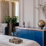 now focusing on Bedroom 2. Embracing a minimalist approach, our aim is to create a serene retreat that exudes understated elegance. The focal point of the room is a Dark Magenta bed, serving as a striking centrepiece against a backdrop of muted tones. A black side table complements the bed, providing a functional yet stylish accent. The bed panel features a subtle curve, adding a touch of sophistication, while cove lighting above creates a soft, ambient glow, perfect for relaxation. Wardrobes adorned with leather-finished panels and rose gold metal detailing offer ample storage space, seamlessly integrating form and function.